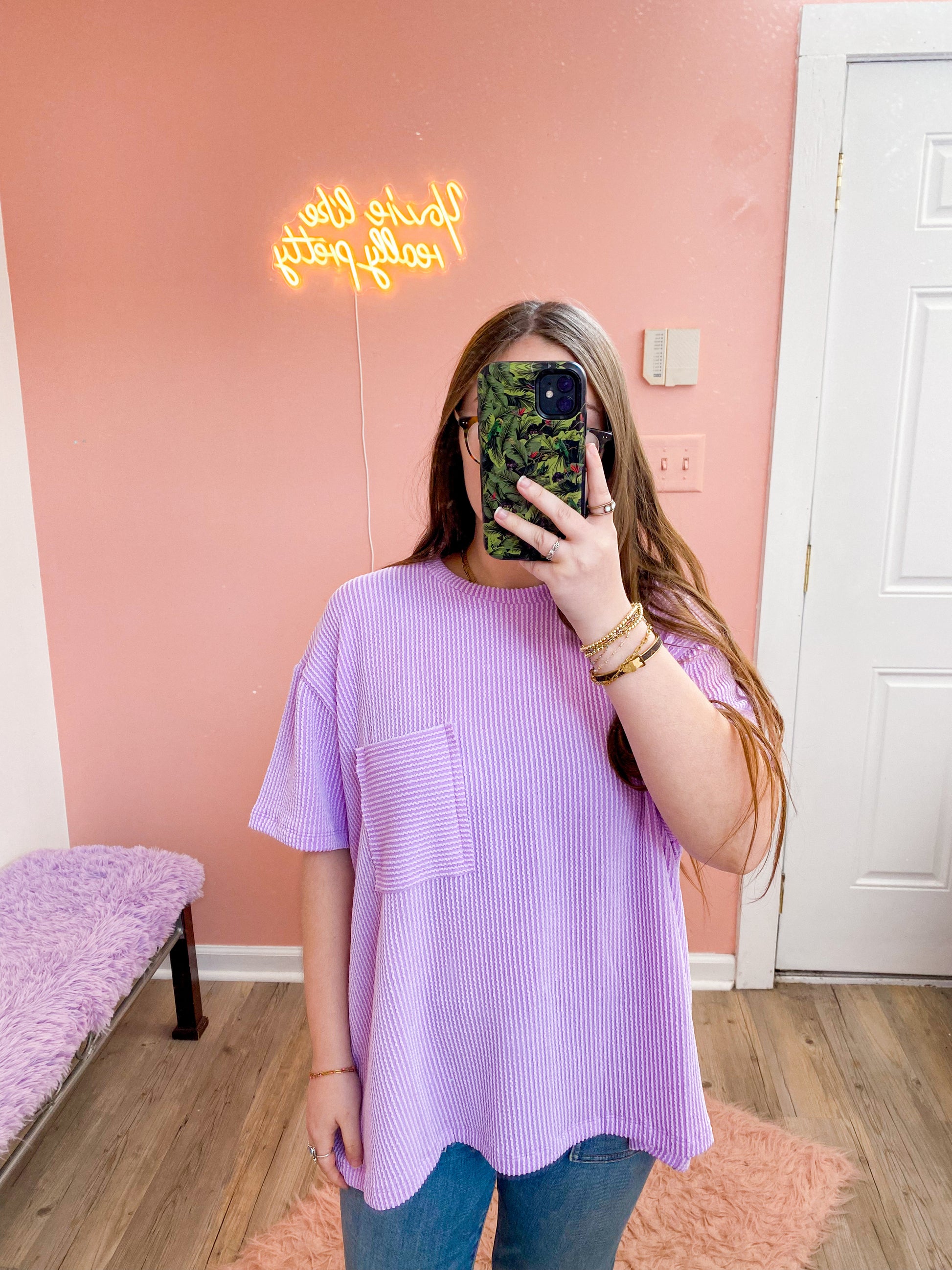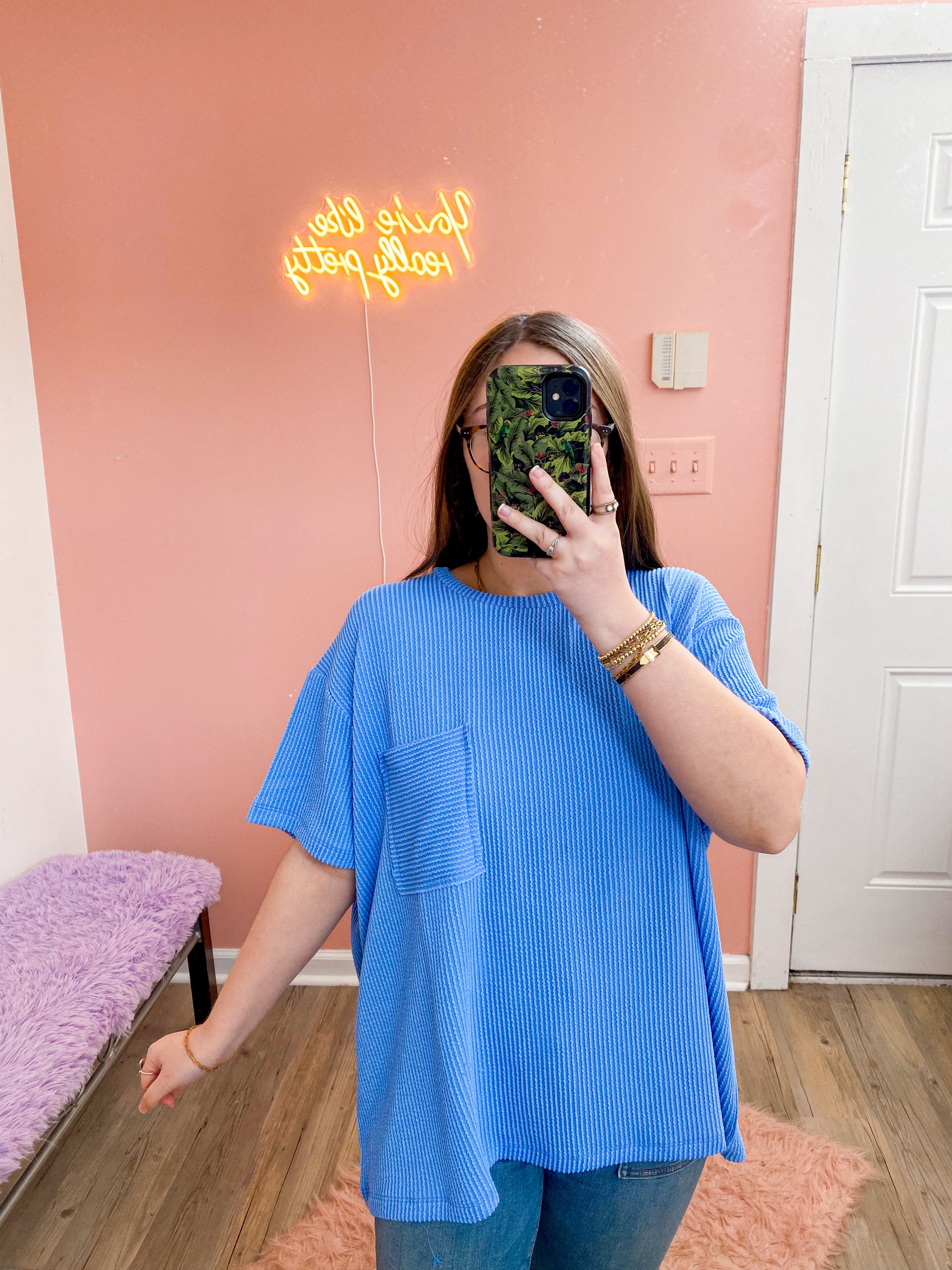 The Heavenly Tee is made from a super soft ribbed material that feels like a dream against your skin. With multiple color options to choose from, you can find the perfect tee to match any outfit. Complete with a convenient pocket, this tee is perfect for everyday wear.